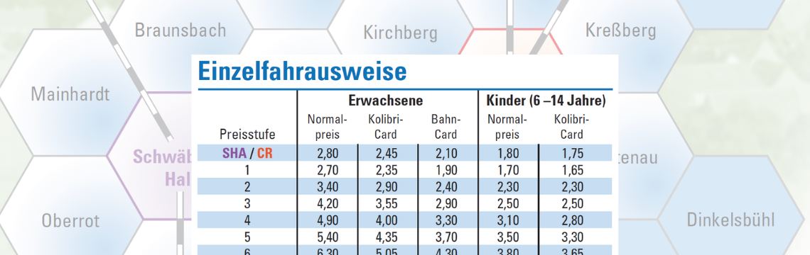 The price of the RegioTarif depends solely on the number of tariff zones traversed on the route (start and end zone both count).